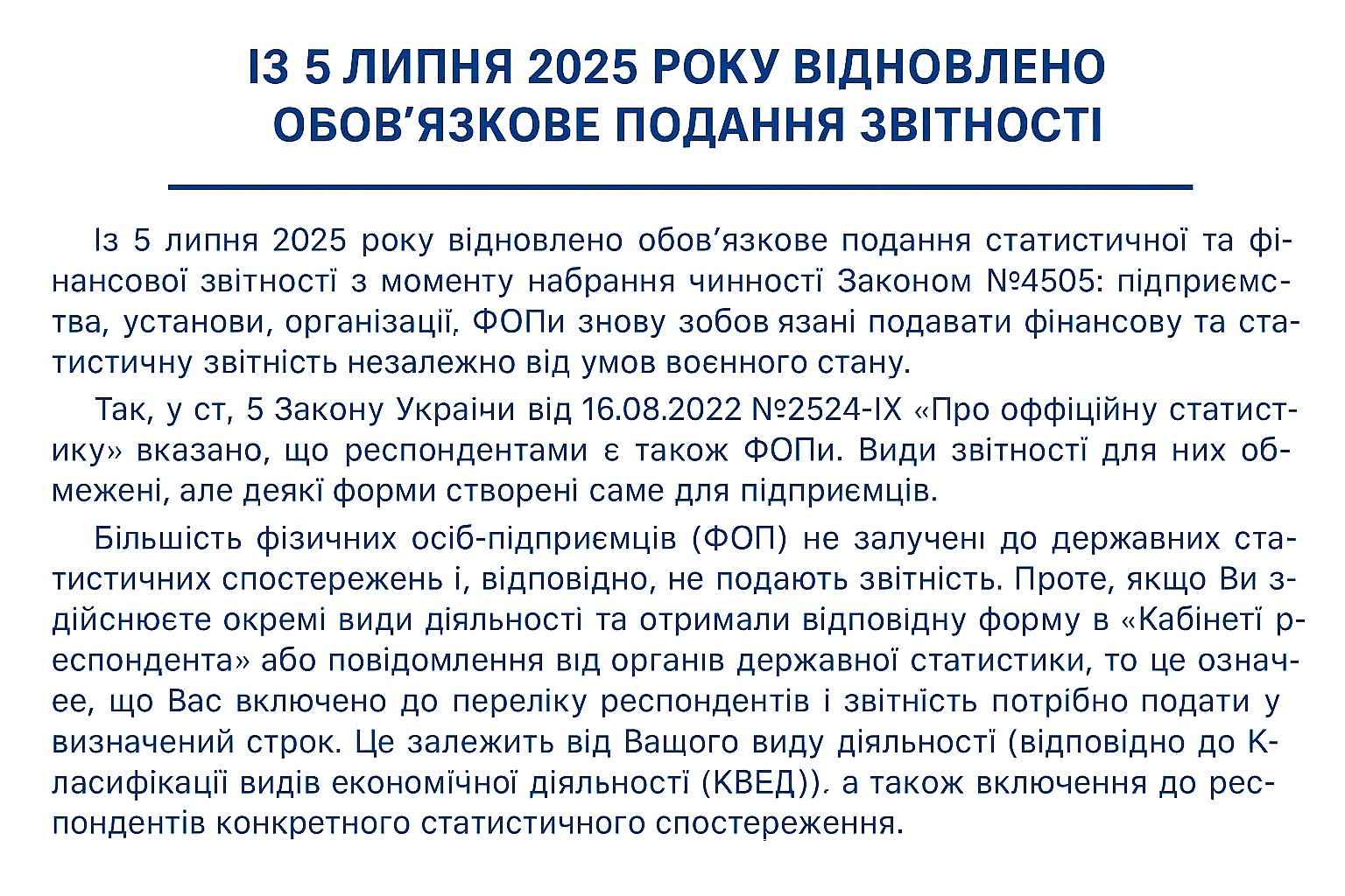 Із 5 липня 2025 року відновлено обов’язкове подання статистичної та фінансової звітності з моменту набрання чинності Законом  №4505: підприємства, установи, організації, ФОПи знову зобов’язані подавати фінансову та статистичну звітність незалежно від умов воєнного стану. Так, у ст. 5 Закону України від 16.08.2022 №2524-IX «Про офіційну статистику» вказано, що респондентами є також ФОПи. Види звітності для них обмежені, але деякі форми створені саме для підприємців.