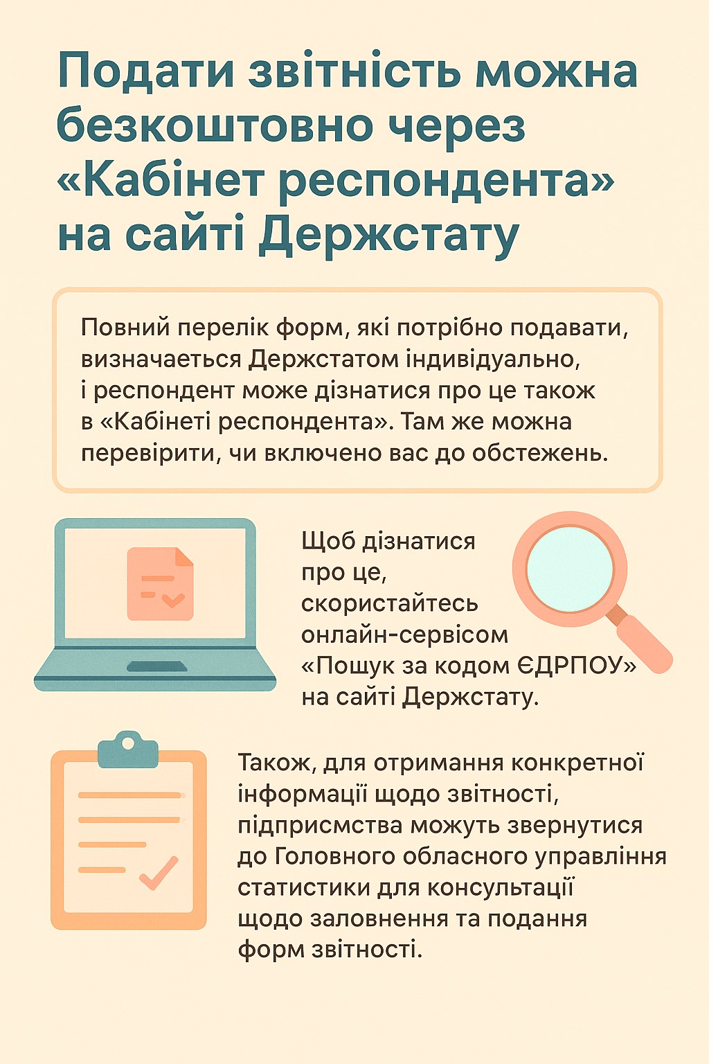 Подати звітність можна безкоштовно через «Кабінет респондента» на сайті Держстату. Повний перелік форм, які потрібно подавати, визначається Держстатом індивідуально, і респондент може дізнатися про це також в «Кабінеті респондента». Там же можна перевірити, чи включено вас до обстежень.