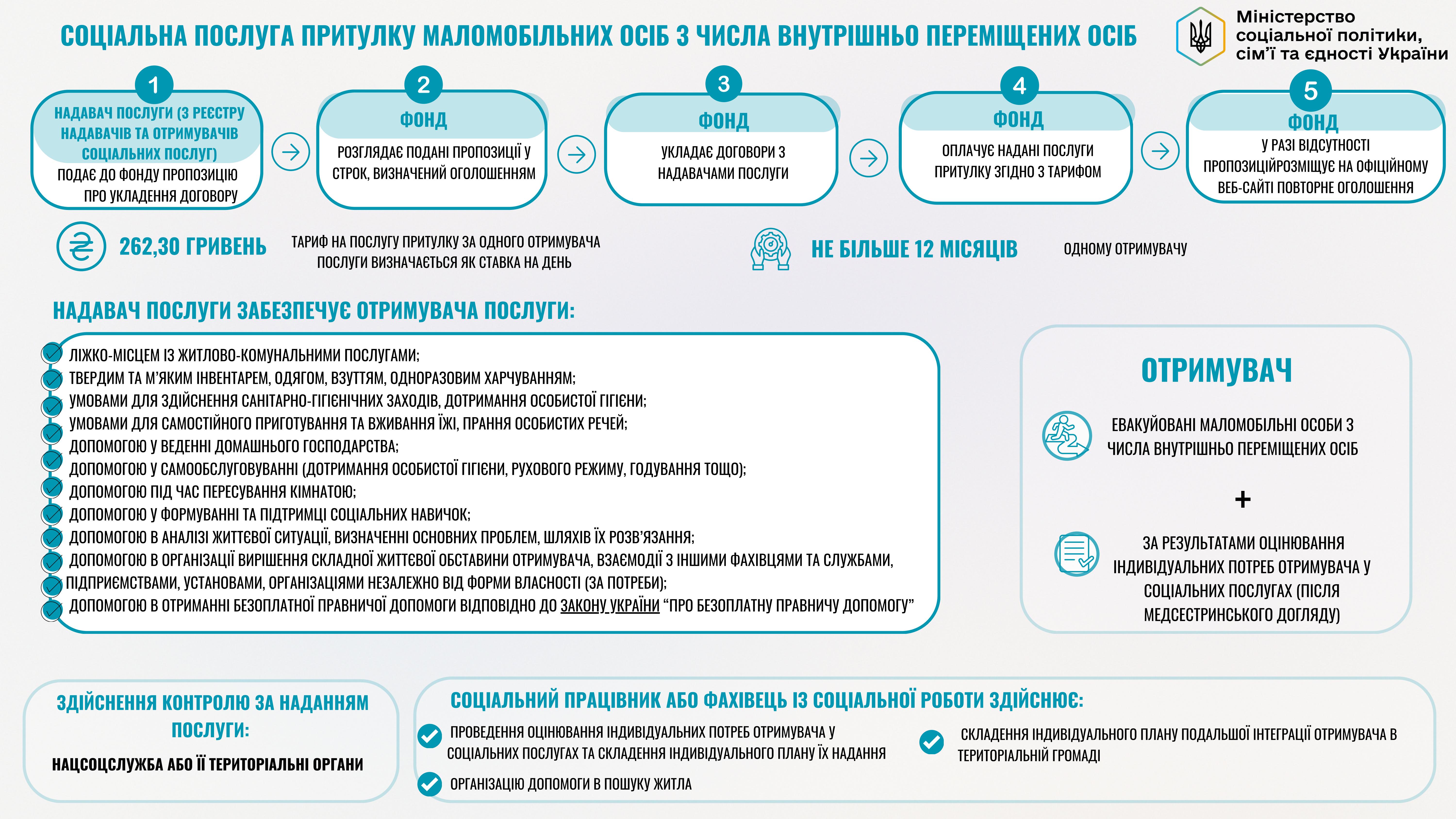 Відповідно до Постанови Кабінету Міністрів України від 17.09.2025 № 1169 в Україні запроваджено послугу тимчасового притулку для маломобільних внутрішньо переміщених осіб.